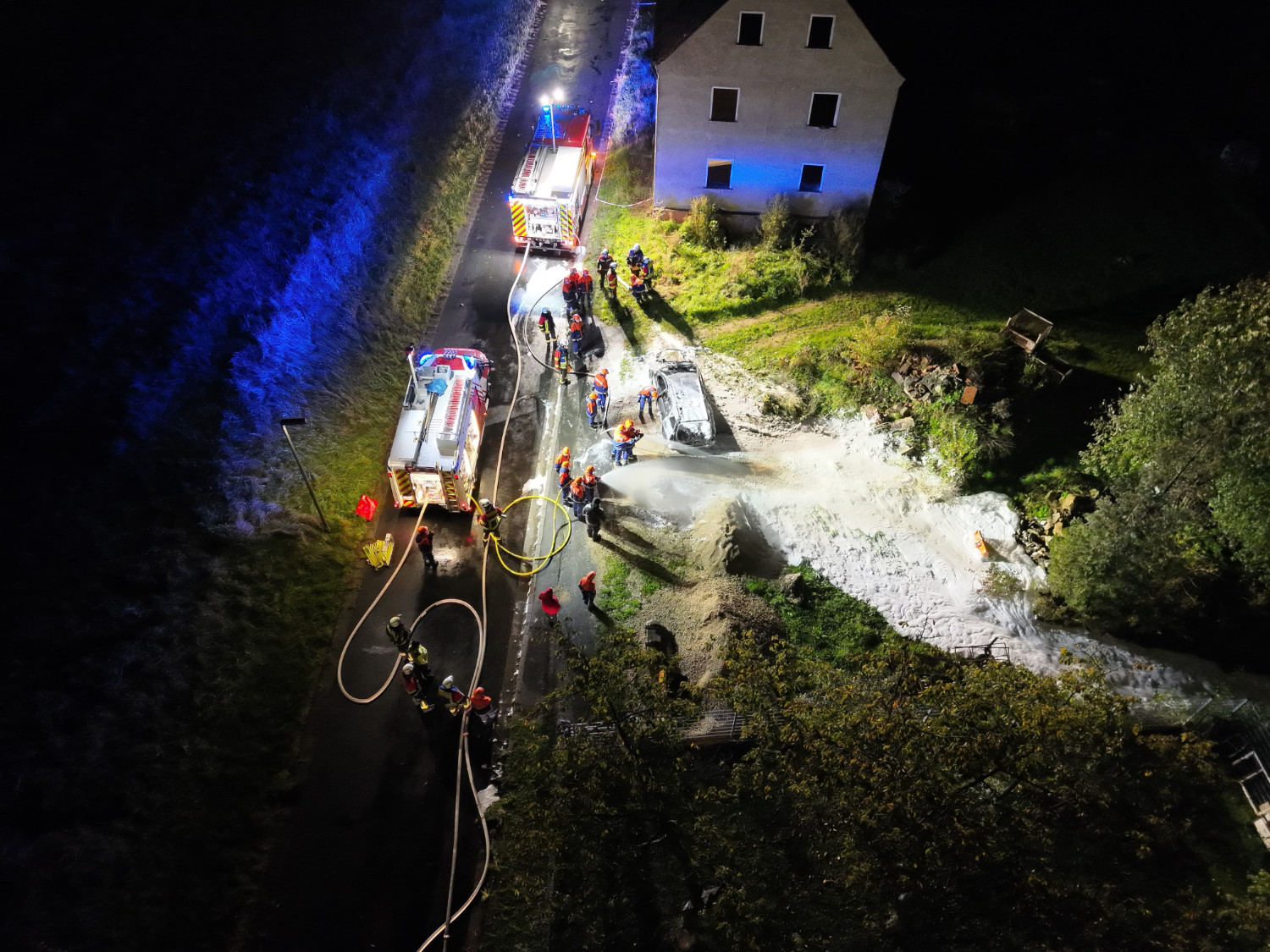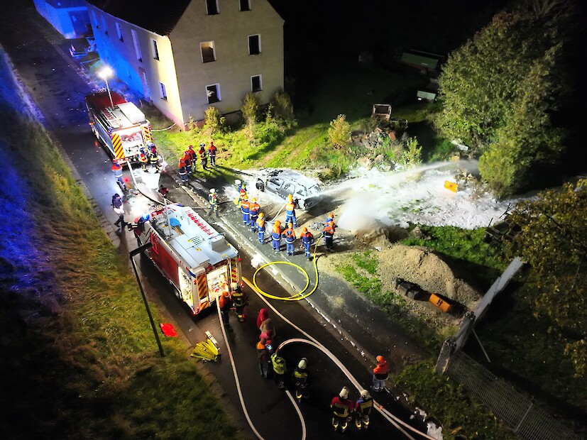 Für die verbliebenen Fahrzeuge ging es derweil zu einem brennenden PKW am Kagerhof. Die vorangegangenen Ausbildungen des Tages zeigten Wirkung. Der Löschaufbau wurde rasch aufgebaut und Wasser zur Kühlung des Fahrzeugs abgegeben. Im weiteren Verlauf wurde entschieden, Schaum als weiteres Löschmittel einzusetzen und das Fahrzeug mit diesem zu bedecken.