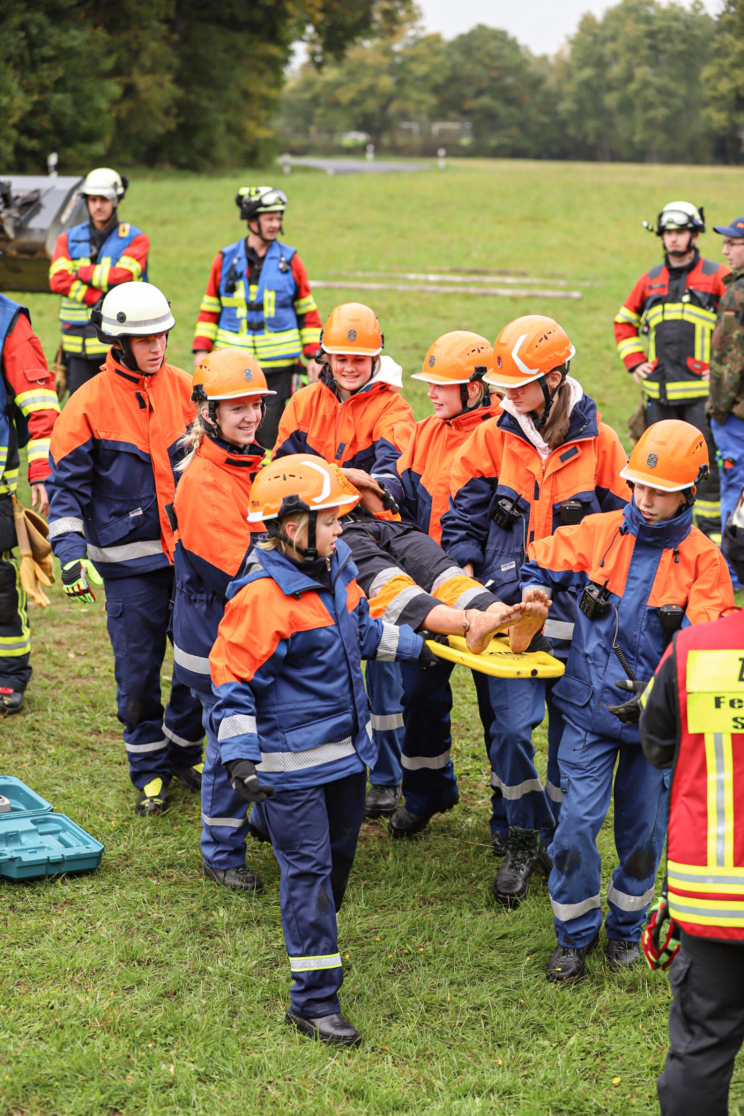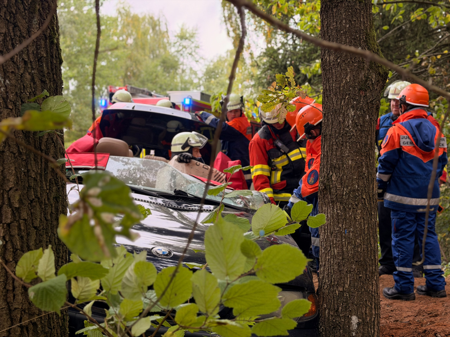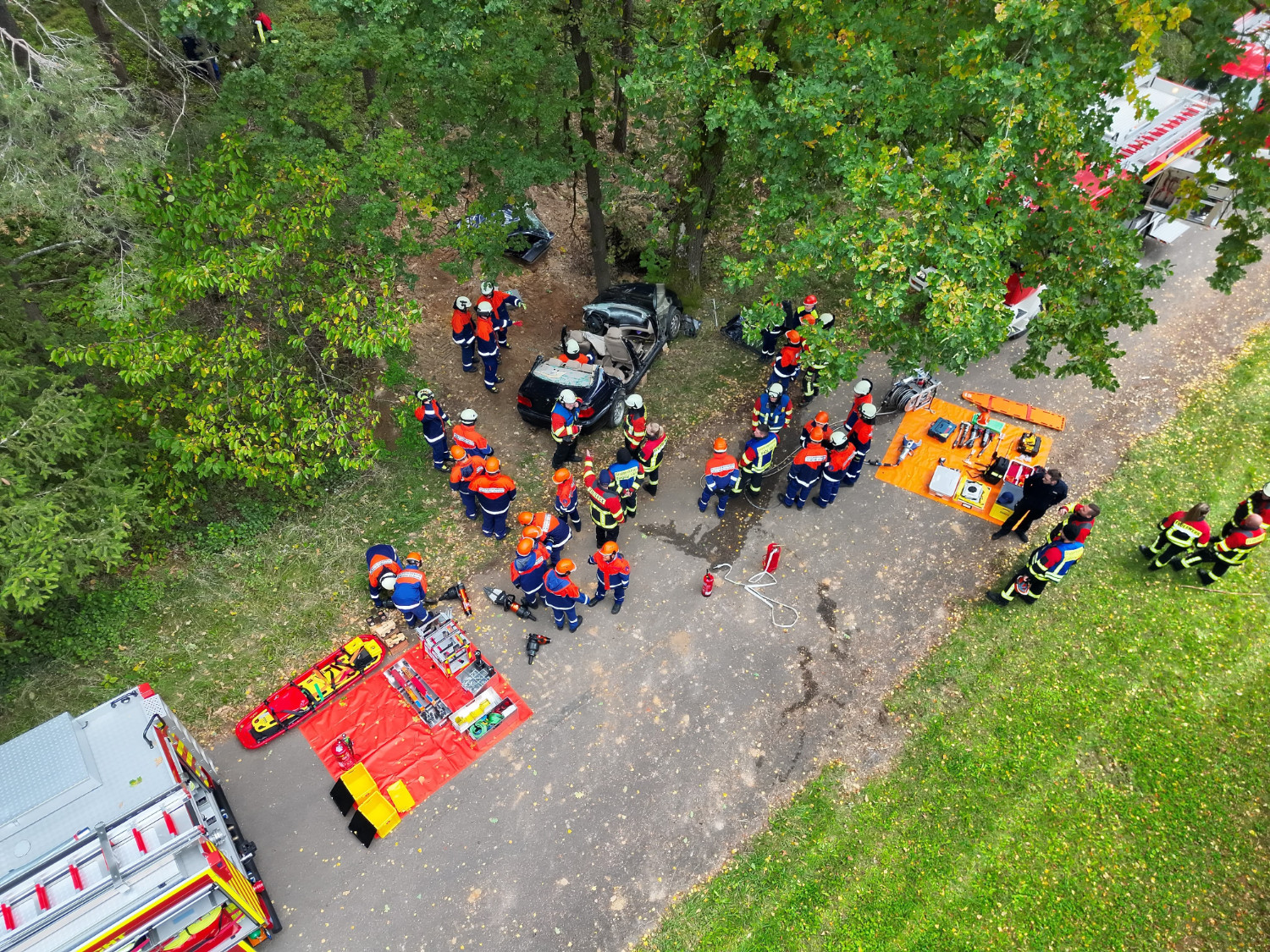 Für den Nachmittag stand der Punkt "Grundlagen im Löscheinsatz" auf dem Dienstplan beider Wachen. Während der Vorbereitung hierzu ertönte allerdings der Alarmton der Smartphones für die Besatzung zweier Fahrzeuge der Wache Schlicht. Ein Verkehrsunfall war gemeldet. Planmäßig wurde der Unterricht für die übrigen Teilnehmer weitergeführt, bis schließlich eine Nachforderung eines weiteren Rettungssatzes erfolgte. Eine Person war mit seinem PKW gegen einen Baum gefahren und konnte sich nicht mehr aus seinem Fahrzeug befreien. Durch die Übungs-Leitstelle wurden nun mehrere Fahrzeuge aus den Wachen Vilseck und Schlicht zur Einsatzstelle am Kreuzberg geschickt. Vor Ort wurde den Jugendlichen in Ruhe das Arbeiten bei einem Verkehrsunfall gezeigt und praktisch angeleitet: Von der Vorbereitung einer Bereitstellungsplane, über die Betreuung des Patienten im Fahrzeug bis zum selbstständigen Arbeiten mit hydraulischem Rettungsgerät. Auch die Unterrichtssequenz der verbliebenen Gruppen auf den Wachen sollte bald enden...