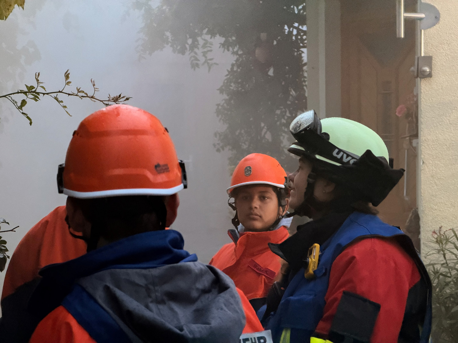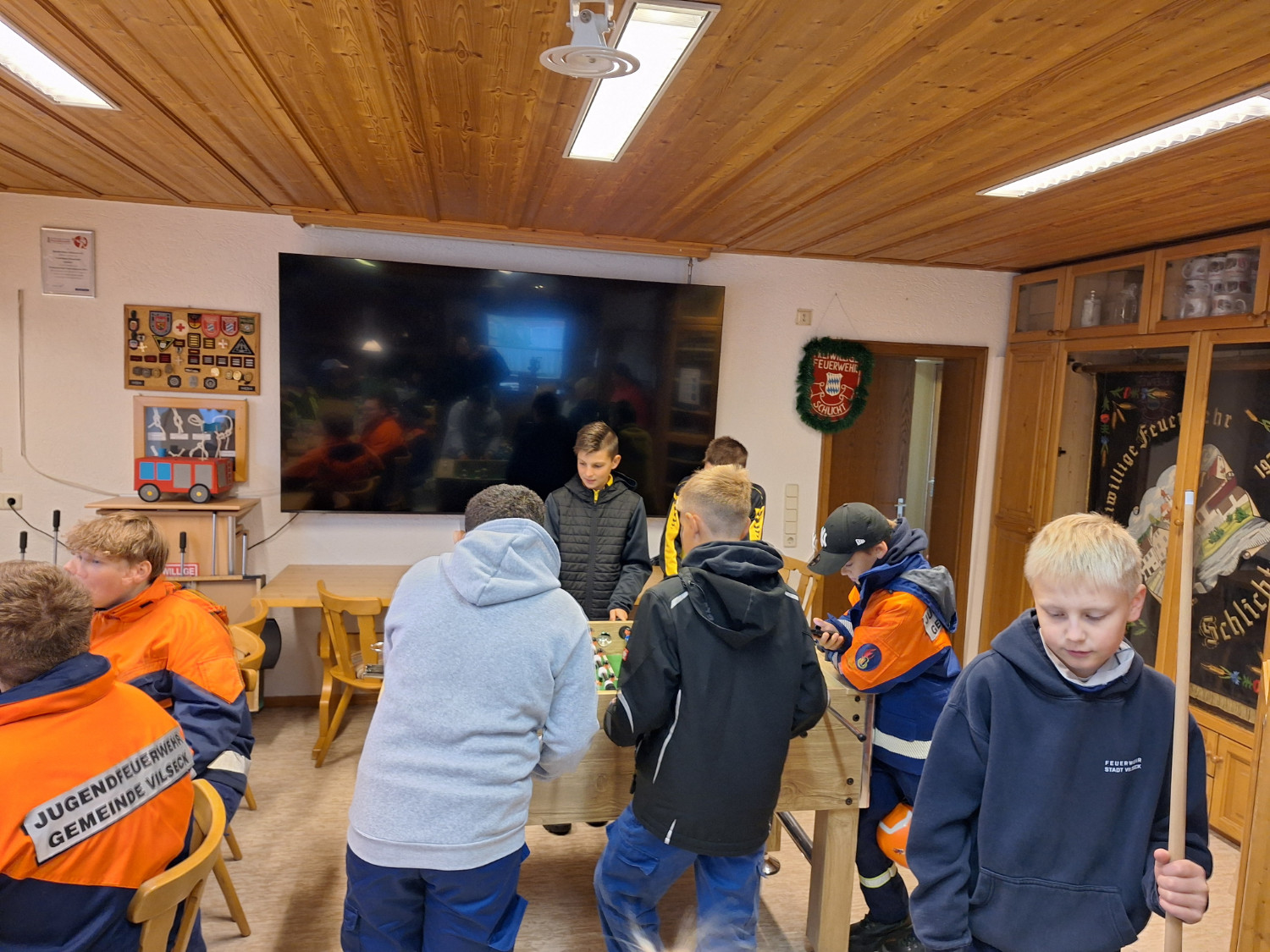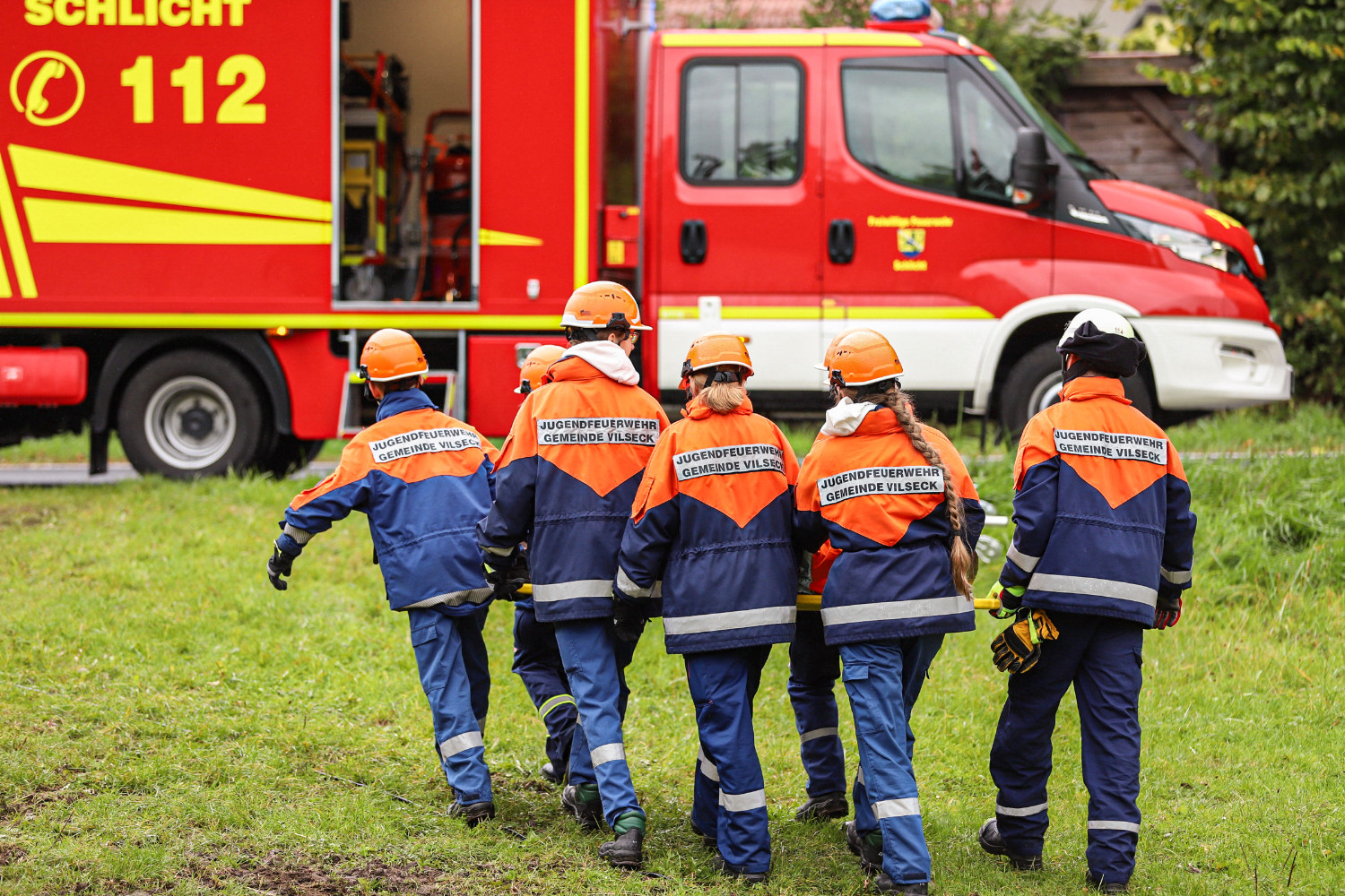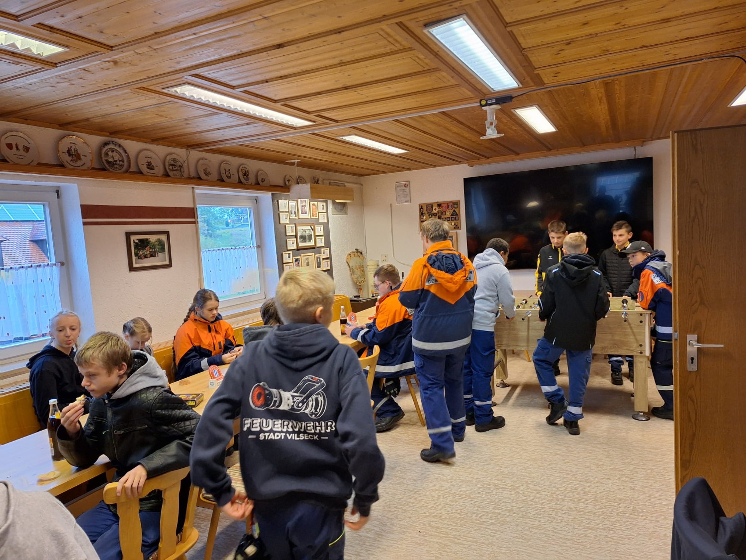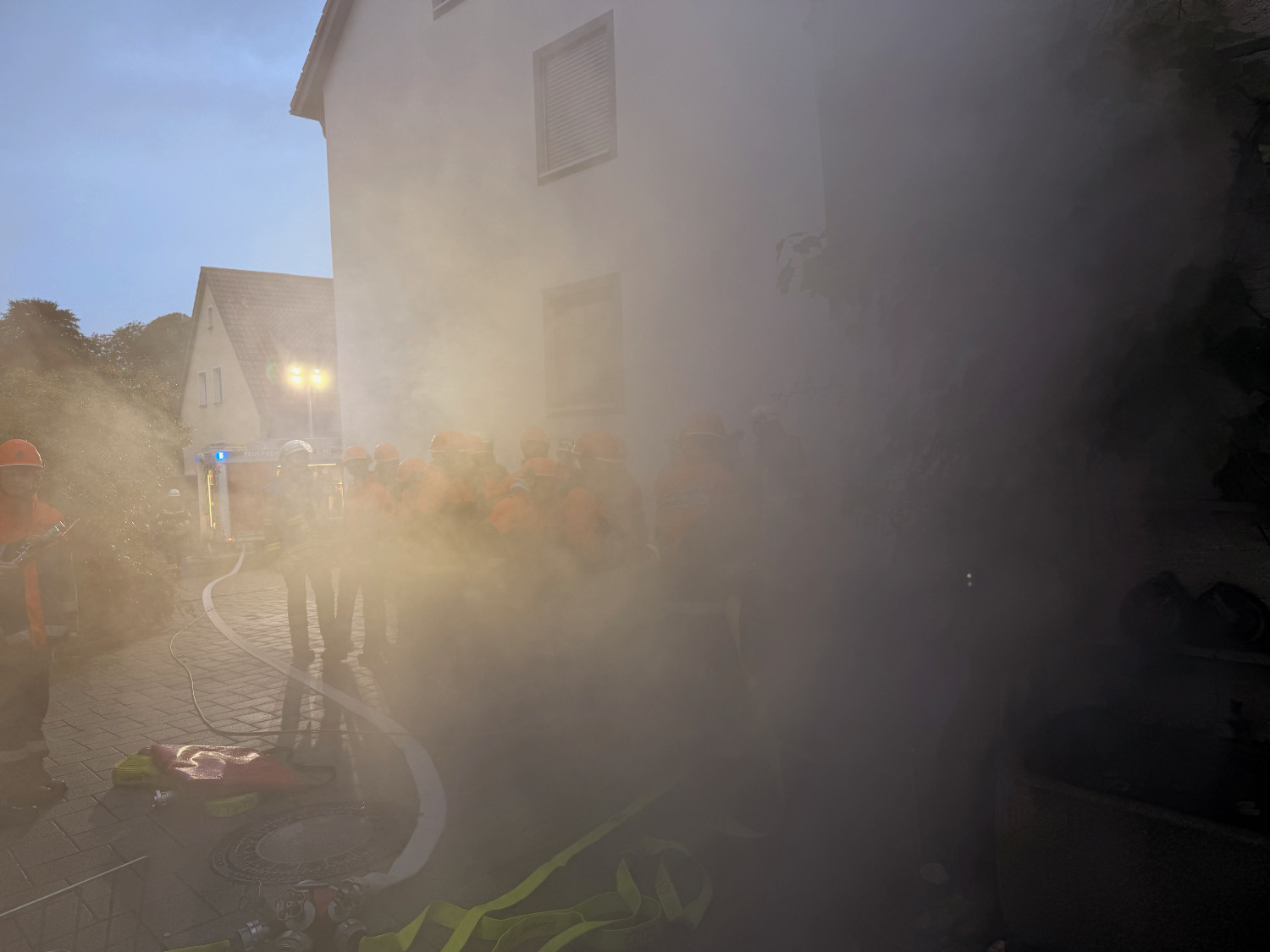 Nach zwei fordernden Übungs-Einsätzen stand nach der Reinigung der eingesetzten Gerätschaften die Kaffeepause an, die ausgiebig genutzt wurde. Viele leckere Kuchen, die durch die Familien der Jugendlichen (und der Jugendlichen selbst) gebacken wurden, sorgten für einen Energieschub. Nach dem Wechsel der Besatzungen der Fahrzeuge und während eines Regenschauers über Vilseck, wurden die Jugendlichen in der Fahrzeughalle der Feuerwehr Stadt Vilseck in der Jugendflamme Stufe I ausgebildet: Viele feuerwehrtechnische Grundlagen wurden wiederholt, manchmal neu vermittelt und mit Spaß verbunden. In der anschließenden Abnahme der Jugendflamme überzeugten alle Teilnehmer die Prüfer und konnten das Abzeichen erhalten. Herzlichen Glückwunsch! Noch vor dem Aufstellen zum Gruppenfoto ertönte für die Wache Schlicht der Alarm: "Brand Schreinerei". Beim Eintreffen der Fahrzeuge fanden die Jugendlichen eine sehr stark verrauchte Schreinerei vor. Der simulierte Feuerschein rundete den dramatischen Eindruck ab. Rasch wurde der Löschaufbau durchgeführt und weitere Schritte eingeleitet. "Ist noch eine Person in der Werkstatt?" Die Absuche ergab, dass sich keine Person in der Werkstatt befand. Zudem zeigten die Löschmaßnahmen Wirkung. Im Anschluss an diesen Übungs-Einsatz wurde die Wache Schlicht aufgeräumt, persönliche Gegenstände eingepackt und die Wache wieder an die Feuerwehr Schlicht übergeben. Nach dem Abendessen war die Übernachtung im Feuerwehrhaus der Feuerwehr Stadt Vilseck geplant.