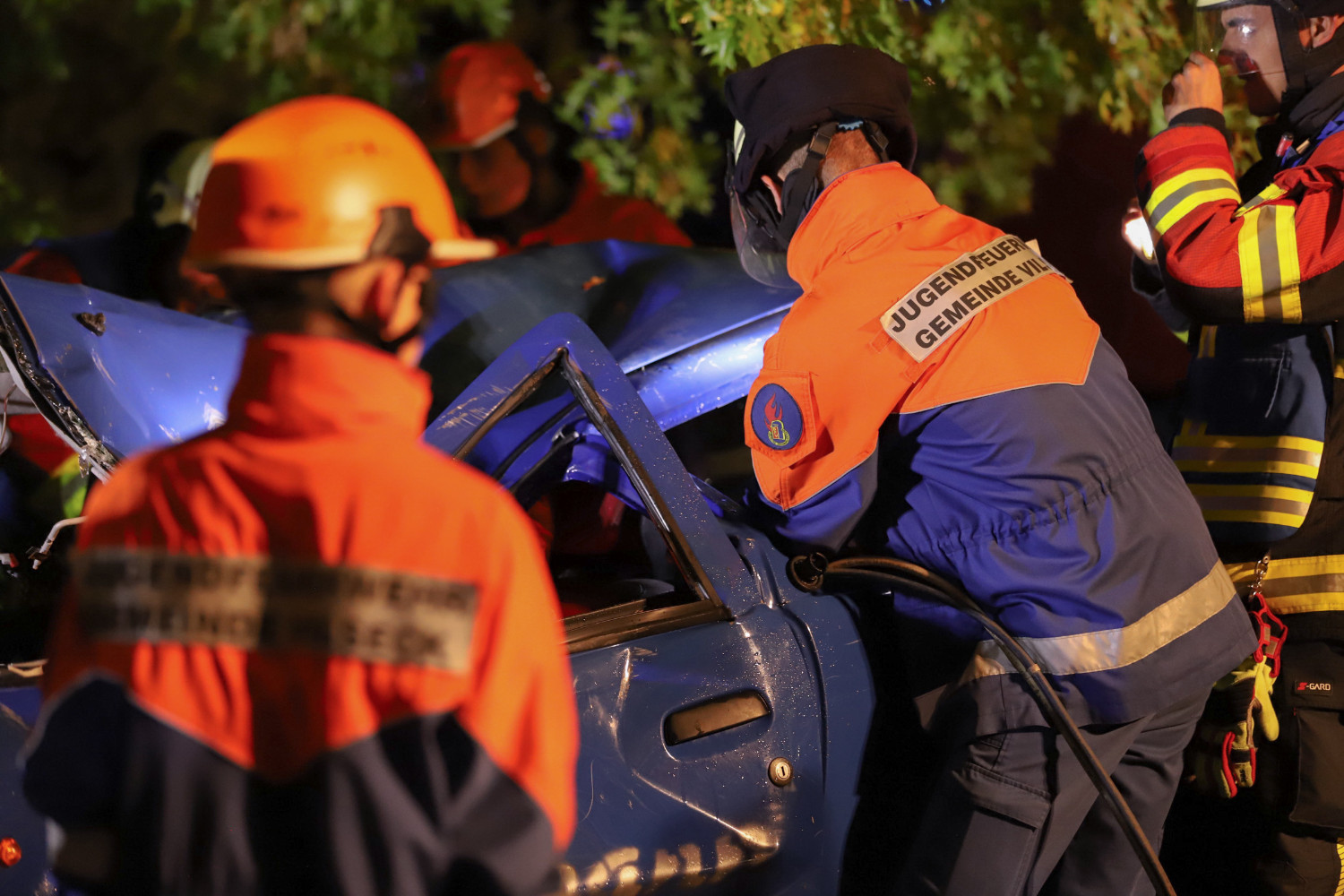 Ein Unfall bei Arbeiten an einem landwirtschaftlichen Gerät führte so zu einem weiteren wachübergreifen Alarm. Die Rückmeldung der ersten Kräfte war dramatisch: Eine Person verletzte sich schwer bei Arbeiten an einem Zinken eines Heuwenders und zog sich dabei eine Pfählungsverletzung mit starker Blutung zu. Durch die Jugendlichen wurde rasch die medizinische Betreuung eingeleitet und die Blutung gestoppt. Nachdem beide Rettungssätze auf Grund des Verkehrsunfalles nicht verfügbar waren, mussten sich alle Beteiligten eine alternative schonende und praktische Lösung ausdenken. Parallel dazu wurde ein Sichtschutz aufgebaut, um die verletzte Person vor neugierigen Blicken zu schützen. Mit einem Winkelschleifer wurde schlussendlich der Zinken abgetrennt und der Patient im Anschluss an den Rettungsdienst übergeben.