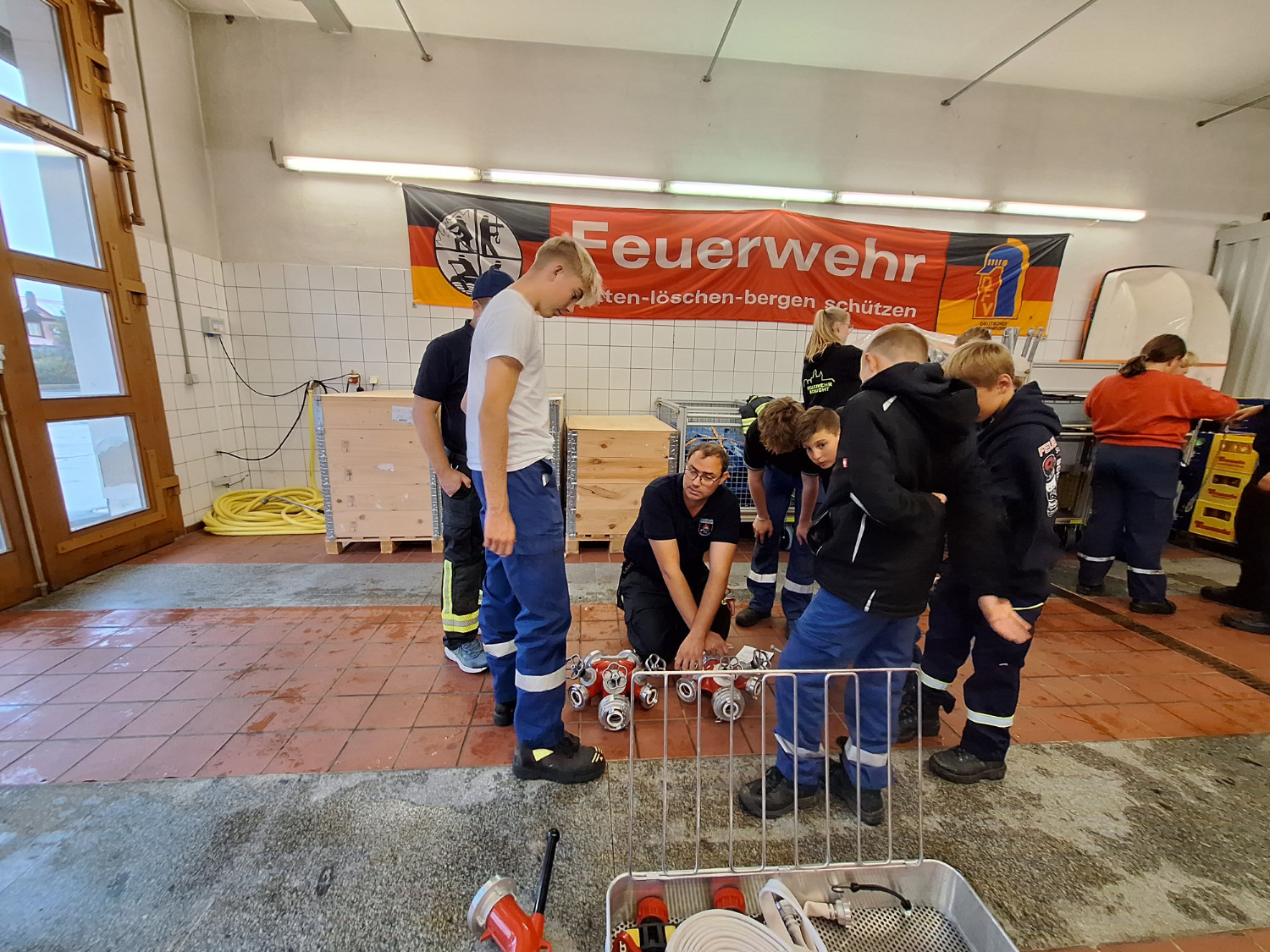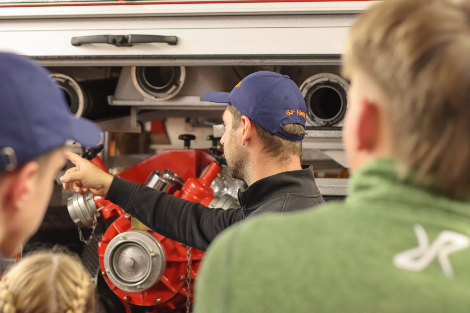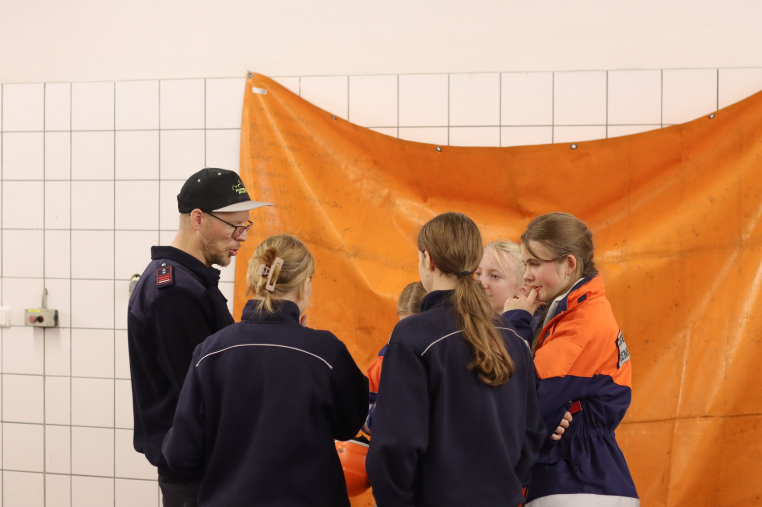 Nach der Fahrzeugübernahme und der Wachbesetzung stand für die Jugendlichen und die Ausbilder die ausführliche Geräteprüfung und Erkundung der Ausrüstung auf dem Dienstplan. Diese Zeit sollte als Grundstein für die Abarbeitung der Einsatzübungen im Tagesverlauf dienen. Die Ausbilder erklärten Gerätschaften und zeigten auf, wo sich bestimmtes Material auf den verschiedenen Fahrzeugen befindet.
