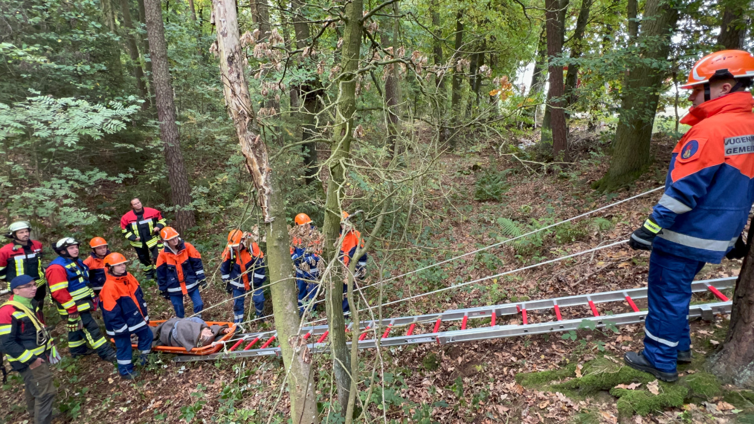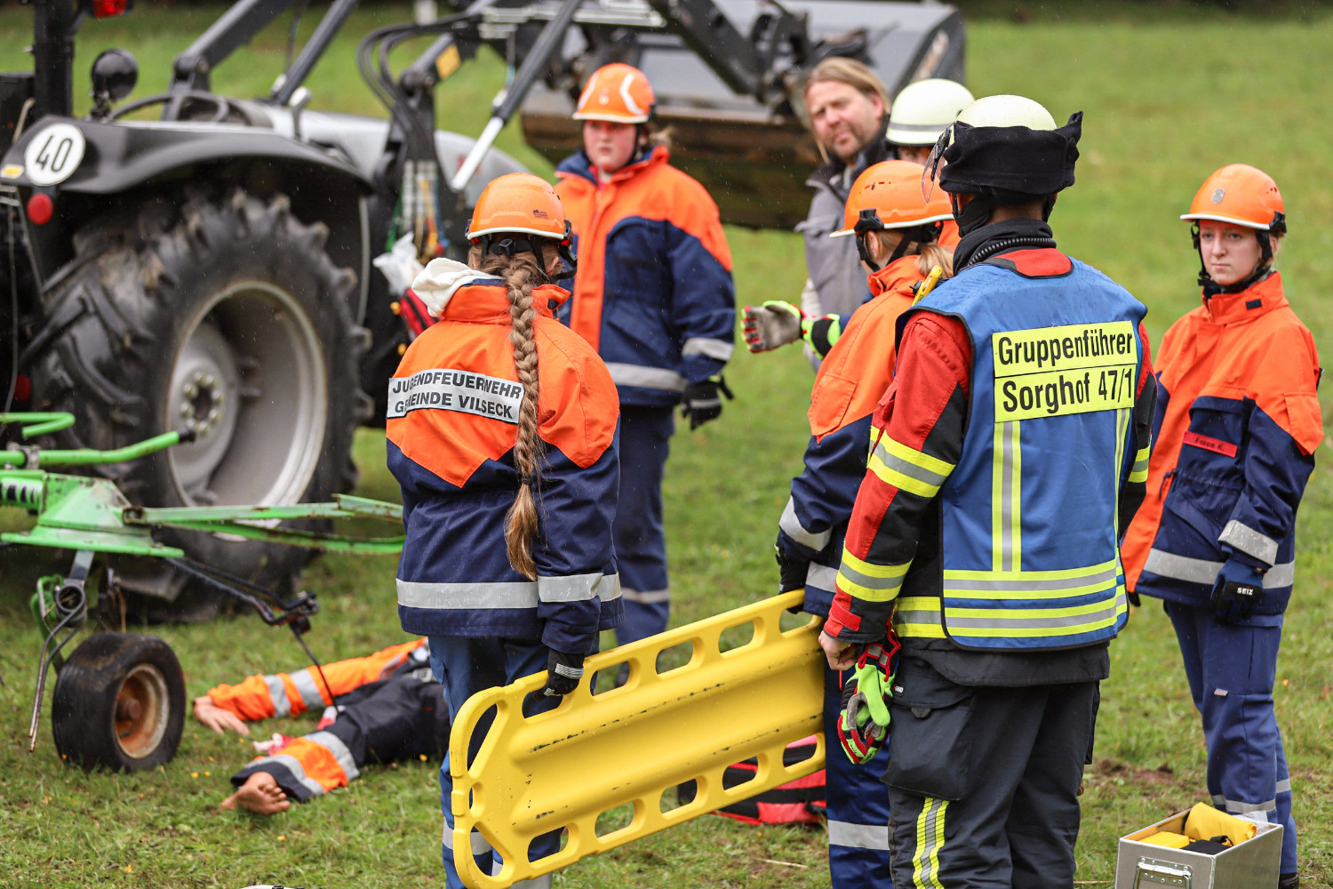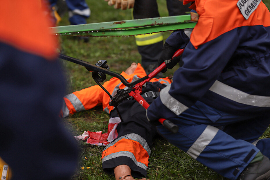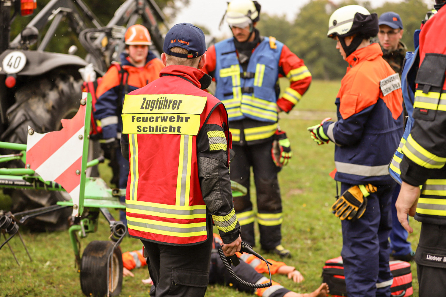 Ein Unfall bei Arbeiten an einem landwirtschaftlichen Gerät führte so zu einem weiteren wachübergreifen Alarm. Die Rückmeldung der ersten Kräfte war dramatisch: Eine Person verletzte sich schwer bei Arbeiten an einem Zinken eines Heuwenders und zog sich dabei eine Pfählungsverletzung mit starker Blutung zu. Durch die Jugendlichen wurde rasch die medizinische Betreuung eingeleitet und die Blutung gestoppt. Nachdem beide Rettungssätze auf Grund des Verkehrsunfalles nicht verfügbar waren, mussten sich alle Beteiligten eine alternative schonende und praktische Lösung ausdenken. Parallel dazu wurde ein Sichtschutz aufgebaut, um die verletzte Person vor neugierigen Blicken zu schützen. Mit einem Winkelschleifer wurde schlussendlich der Zinken abgetrennt und der Patient im Anschluss an den Rettungsdienst übergeben.
