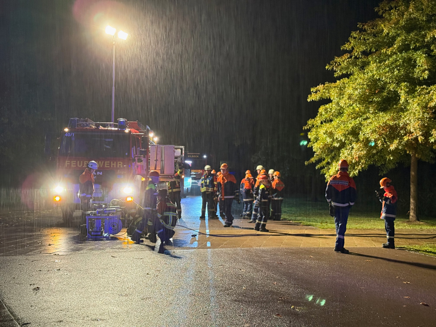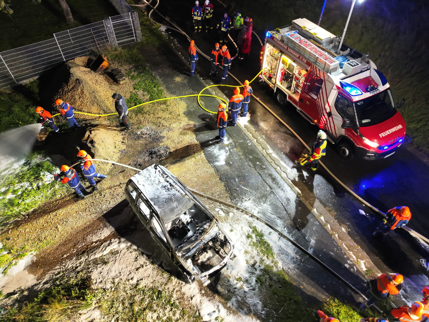 Für die verbliebenen Fahrzeuge ging es derweil zu einem brennenden PKW am Kagerhof. Die vorangegangenen Ausbildungen des Tages zeigten Wirkung. Der Löschaufbau wurde rasch aufgebaut und Wasser zur Kühlung des Fahrzeugs abgegeben. Im weiteren Verlauf wurde entschieden, Schaum als weiteres Löschmittel einzusetzen und das Fahrzeug mit diesem zu bedecken.