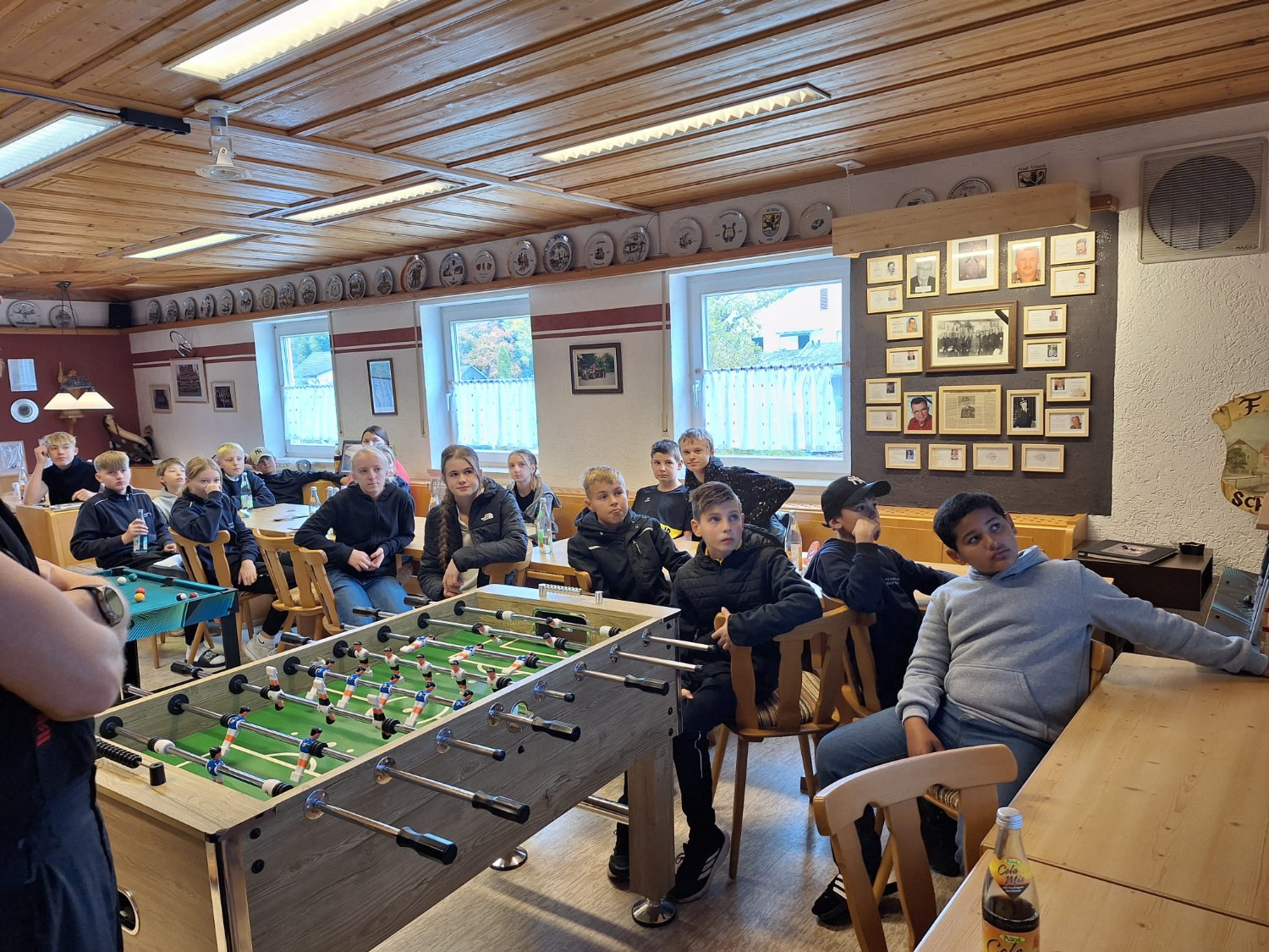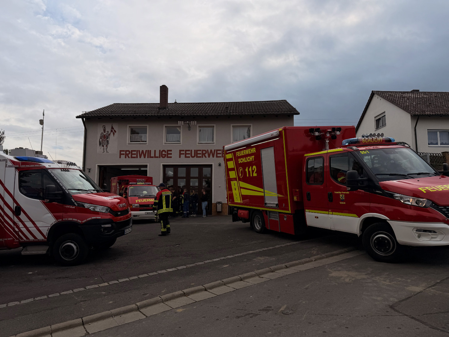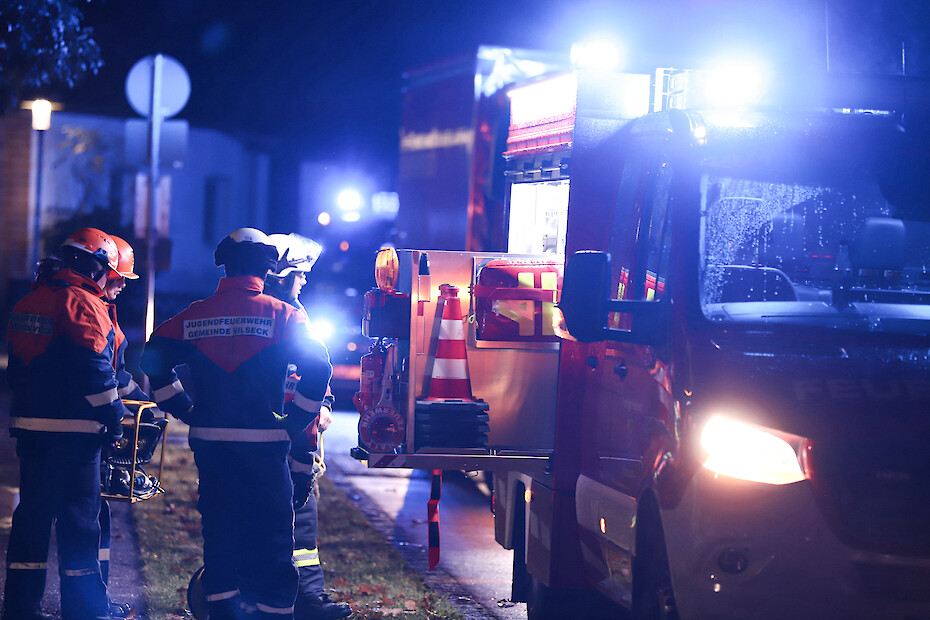 Nach zwei fordernden Übungs-Einsätzen stand nach der Reinigung der eingesetzten Gerätschaften die Kaffeepause an, die ausgiebig genutzt wurde. Viele leckere Kuchen, die durch die Familien der Jugendlichen (und der Jugendlichen selbst) gebacken wurden, sorgten für einen Energieschub. Nach dem Wechsel der Besatzungen der Fahrzeuge und während eines Regenschauers über Vilseck, wurden die Jugendlichen in der Fahrzeughalle der Feuerwehr Stadt Vilseck in der Jugendflamme Stufe I ausgebildet: Viele feuerwehrtechnische Grundlagen wurden wiederholt, manchmal neu vermittelt und mit Spaß verbunden. In der anschließenden Abnahme der Jugendflamme überzeugten alle Teilnehmer die Prüfer und konnten das Abzeichen erhalten. Herzlichen Glückwunsch! Noch vor dem Aufstellen zum Gruppenfoto ertönte für die Wache Schlicht der Alarm: "Brand Schreinerei". Beim Eintreffen der Fahrzeuge fanden die Jugendlichen eine sehr stark verrauchte Schreinerei vor. Der simulierte Feuerschein rundete den dramatischen Eindruck ab. Rasch wurde der Löschaufbau durchgeführt und weitere Schritte eingeleitet. "Ist noch eine Person in der Werkstatt?" Die Absuche ergab, dass sich keine Person in der Werkstatt befand. Zudem zeigten die Löschmaßnahmen Wirkung. Im Anschluss an diesen Übungs-Einsatz wurde die Wache Schlicht aufgeräumt, persönliche Gegenstände eingepackt und die Wache wieder an die Feuerwehr Schlicht übergeben. Nach dem Abendessen war die Übernachtung im Feuerwehrhaus der Feuerwehr Stadt Vilseck geplant.