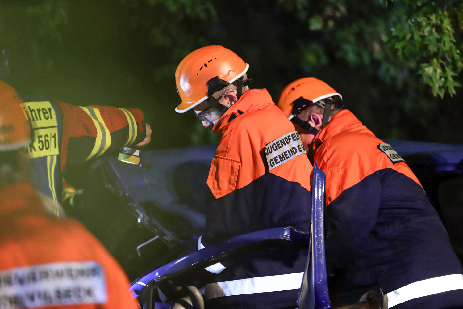 Gestärkt vom Abendessen übergab nun die Wache Vilseck den Speisesaal an die hungrigen Kollegen der Wache Schlicht. Ein kurzer Austausch und schon gingen die Blicke auf die pfeifenden Handys: "Verkehrsunfall mit eingeklemmter Person". Im Bereich der Busspur an der Vilsecker Grund- und Mittelschule kam ein Fahrzeug von dieser ab und kam an einem Baum zum Stehen. Der Fahrer des PKWs konnte sich nicht selbst retten, sodass die Jugendlichen hier tätig werden mussten. Auf Grund der mittlerweile eingesetzten Dunkelheit wurden zuerst einige Maßnahmen zum Ausleuchten ergriffen, ehe weitere Gerätschaften vorbereitet wurden. Auch hier wurde in Ruhe die Lage abgearbeitet und alle notwendigen Schritte ausführlich erklärt. Gerade rechtzeitig vor dem nächsten Schauer konnte die Person befreit, an den Rettungsdienst übergeben und die Einsatzstelle aufgeräumt werden.