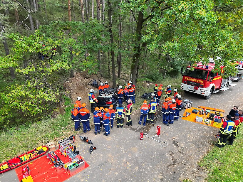 Für den Nachmittag stand der Punkt "Grundlagen im Löscheinsatz" auf dem Dienstplan beider Wachen. Während der Vorbereitung hierzu ertönte allerdings der Alarmton der Smartphones für die Besatzung zweier Fahrzeuge der Wache Schlicht. Ein Verkehrsunfall war gemeldet. Planmäßig wurde der Unterricht für die übrigen Teilnehmer weitergeführt, bis schließlich eine Nachforderung eines weiteren Rettungssatzes erfolgte. Eine Person war mit seinem PKW gegen einen Baum gefahren und konnte sich nicht mehr aus seinem Fahrzeug befreien. Durch die Übungs-Leitstelle wurden nun mehrere Fahrzeuge aus den Wachen Vilseck und Schlicht zur Einsatzstelle am Kreuzberg geschickt. Vor Ort wurde den Jugendlichen in Ruhe das Arbeiten bei einem Verkehrsunfall gezeigt und praktisch angeleitet: Von der Vorbereitung einer Bereitstellungsplane, über die Betreuung des Patienten im Fahrzeug bis zum selbstständigen Arbeiten mit hydraulischem Rettungsgerät. Auch die Unterrichtssequenz der verbliebenen Gruppen auf den Wachen sollte bald enden...