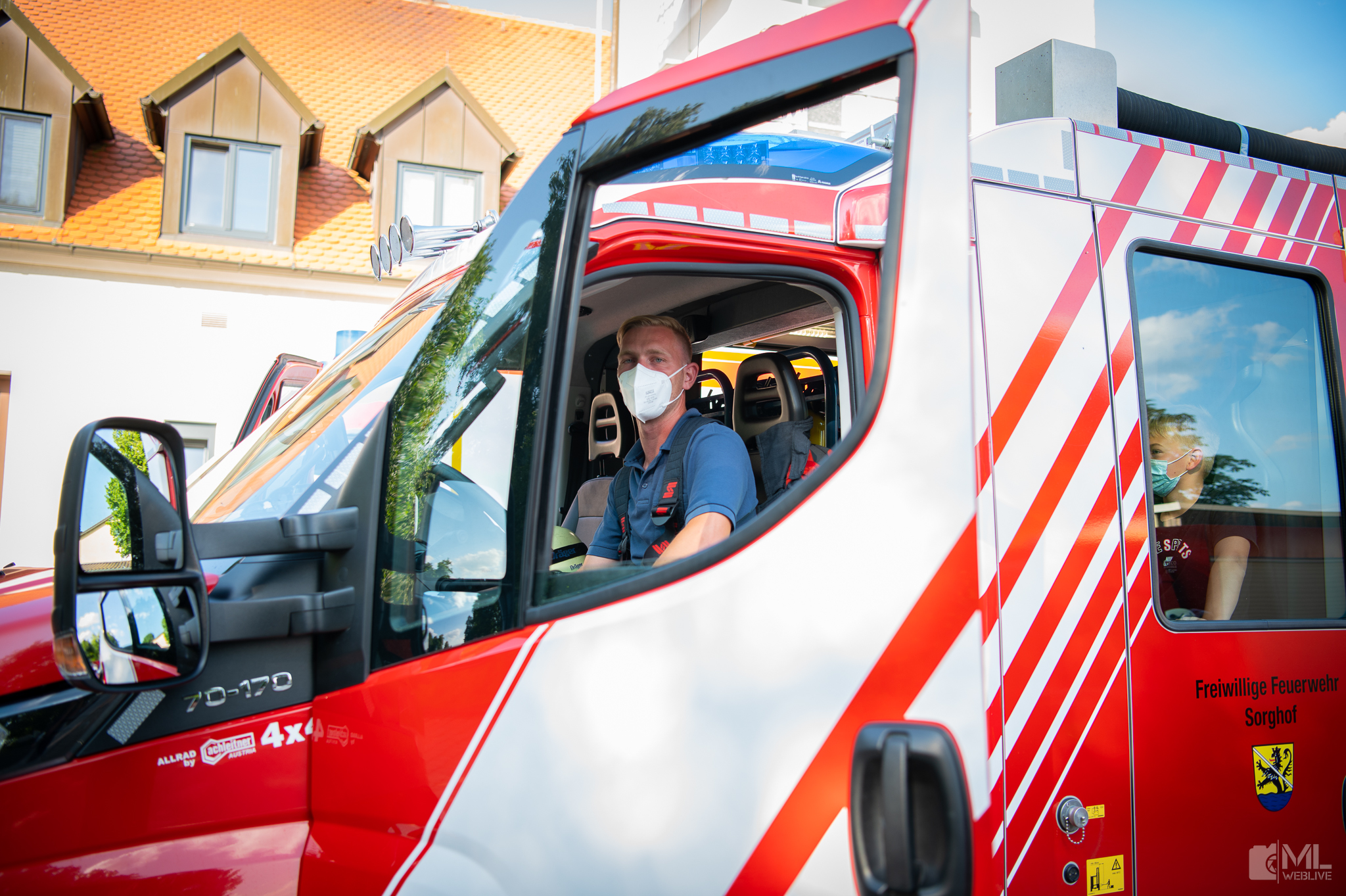 Zwischenzeitlich war auch die Drehleiter der US-Lagerfeuerwehr Vilseck angekommen und konnte sich bei der Einsatzleitung anmelden. In Rücksprache mit dem Gruppenführer des TLF bezog sie Stellung in der Einfahrt zum Anwesen und präsentierte den Jugendlichen unter anderem den Einsatz eines Wenderohres. Nach Abschluss der Übung und dem Rückbau aller eingesetzten Gerätschaften hatte jeder Teilnehmer die Möglichkeit, mit der Drehleiter von oben auf die Stadt Vilseck zu schauen - definitv ein Highlight der Übung!
