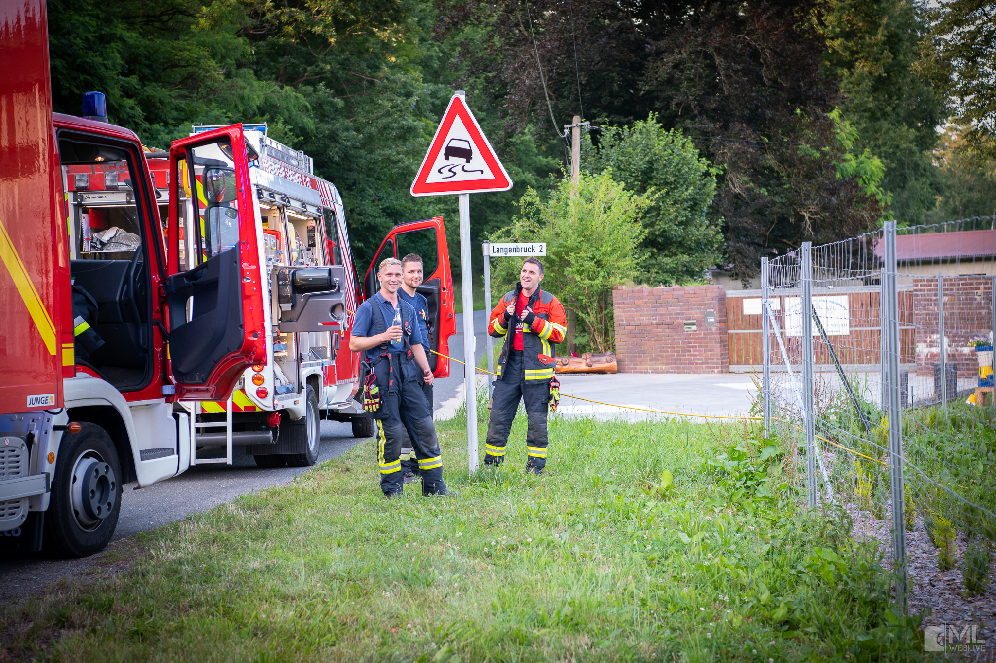 Nach dem Vorgehen unter "Nullsicht" konnte ein Verletzter im Brandobjekt gefunden und durch den Atemschutztrupp in das Freie gebracht werden. Schnell konnte die verletzte Person durch Jugendliche aufgenommen, erstversorgt und zum Rettungdienst gebracht werden. Dieser übernahm die Versorgung am Verletztensammelplatz und erklärten grundlegende Maßnahmen sowie den Aufbau ihres Rettungstransportwagens (RTW). Im Gespräch mit dem Verletzten wurde klar, dass sich dessen Bruder noch im Haus befinden müsste, weswegen ein weiterer Trupp unter Atemschutz zur Personenrettung vorgeschickt wurde. Auch dieser Trupp konnte die zweite vermisste Person rasch im ersten Obergeschoss der Hauses finden und diese über eine schmale Treppe zu den bereitstehenden Kräften bringen. Alle Personen gerettet!